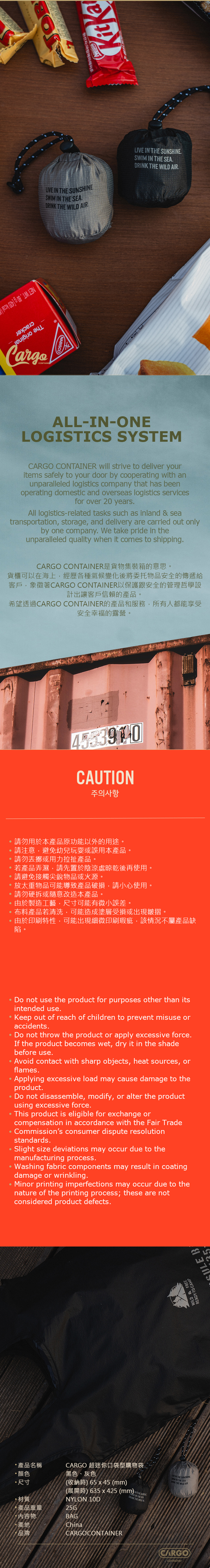 此為預購商品,下單後備貨約14-35個工作日(不含六日)出貨,若提早到貨會盡快寄出,到貨後約1-3個工作日送達您指定的地址 露營、旅行、運動、日常使用 超迷你尺寸(65×45mm) 超輕量(僅 25g) 10D 尼龍 Ripstop 布料